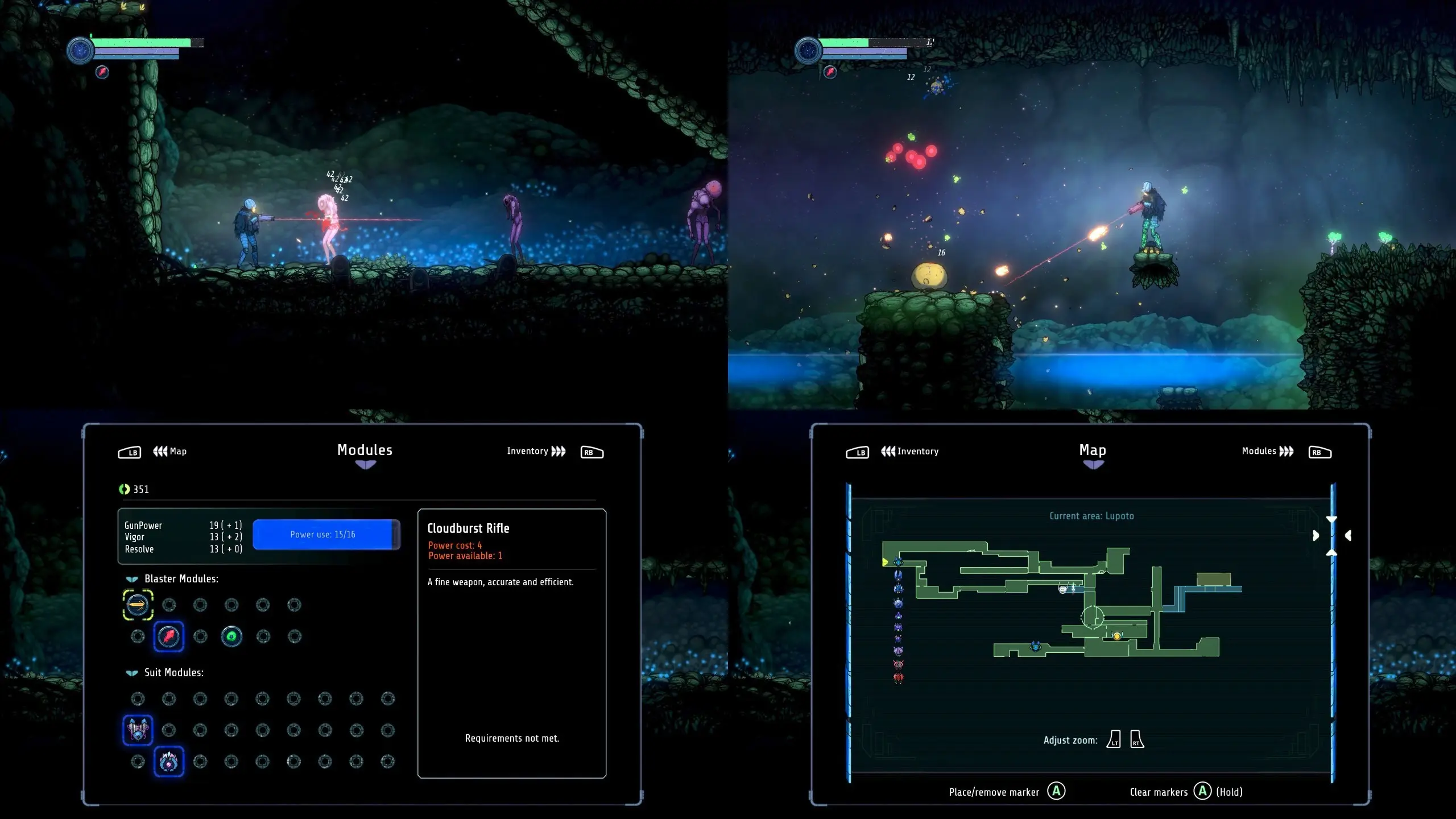 Ogólnie to grało mi się dobrze. Ghost Song tworzyło połączenie Hollow Knighta (pod względem mechanik) z Metroidem (pod względem stylistyki tj. roboty, kosmici). Jako największe plusy wskazałbym dialogi głównej bohaterki, bo były na swój sposób urocze, a także oprawę audiowizualną – szczegółowe tła i ambientową muzykę w tle. Reszta rzeczy jak punkty zapisu i teleportu, kupno ulepszeń, szczegółowa mapa, przeciwnicy czy bossowie to była dobrze wykonana klasyka gatunku metroidvania. Czyli dla fanów tego gatunku tytuł w sam raz 🌝👍